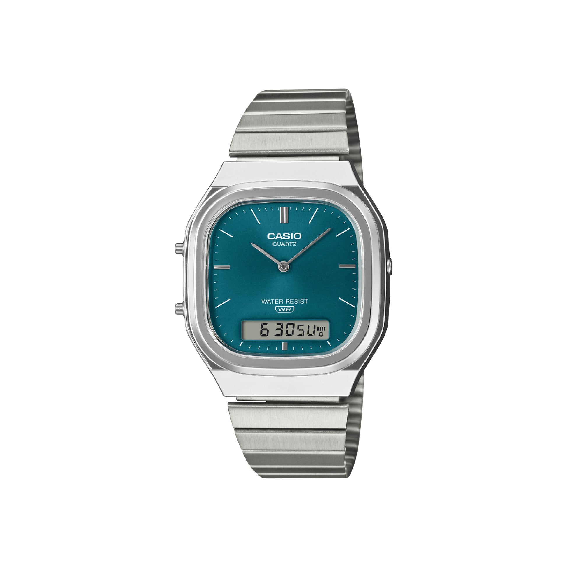 AQ-240 analog-digital dengan layar ganda menghadirkan nuansa retro-modern. Dengan muka yang agak persegi panjang, diimbangi oleh casing yang membulat halus dan lekukan logam yang lembut, jam tangan ini memancarkan kecanggihan.