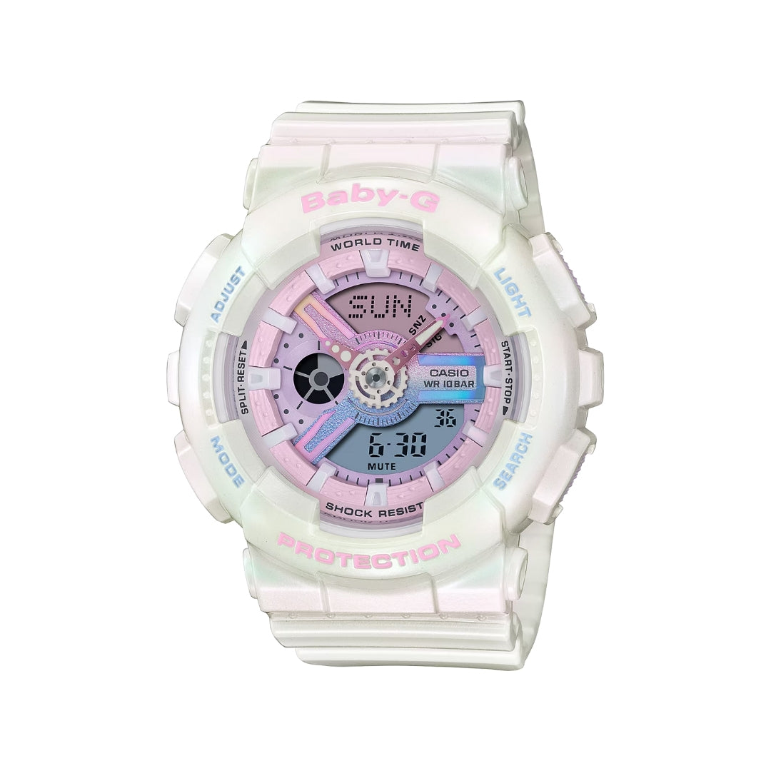Casio Baby-G jam tangan wanita dengan format analog digital. Jam tangan BABY-G menawarkan kemewahan dalam desain maskulin trendi yang berwarna-warni. Warna terpolarisasi berpadu indah seiring berubahnya sudut tampilan. Indeks dan komponen dial dilengkapi lapisan terpolarisasi, dengan tombol dan huruf berwarna pink, ungu, serta biru pastel. Skema warna kreatif memperhalus casing berukuran besar yang modis dan tali jam tangan yang lebar untuk menciptakan desain yang menawan dan unik.
