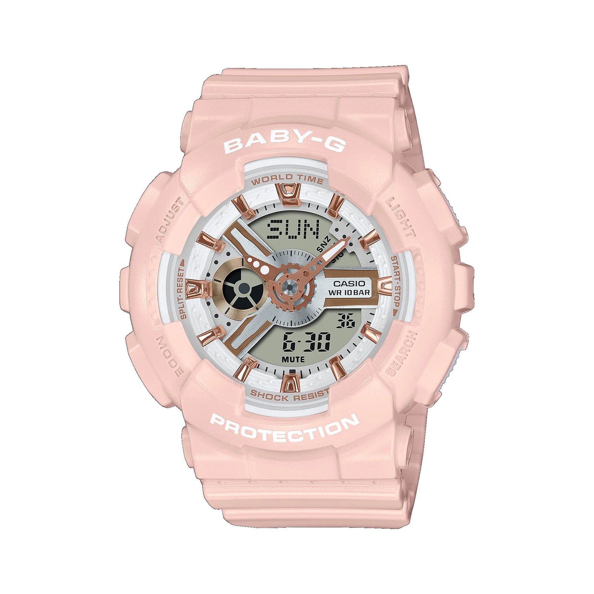 Casio Baby-G jam tangan wanita dalam format Analog Digital. Dengan kenakan percikan warna yang bersih dan segar dengan eye-catcher yang terinspirasi dari desain popular. Kombinasi rumit dari dial, tanda indeks, dan komponen lainnya membangkitkan roda gigi mekanis dengan semburan ketajaman yang menambah semburan energi. Menonjol dalam mode jalanan, BABY-G ini juga menghadirkan fungsi. Nikmati fungsi praktis dan andal seperti lampu LED dan stopwatch, serta tahan guncangan dan air yang Anda andalkan.