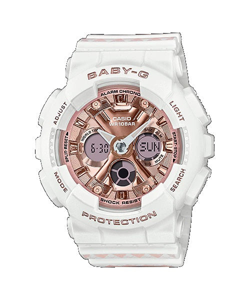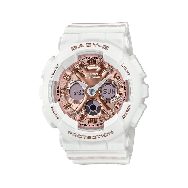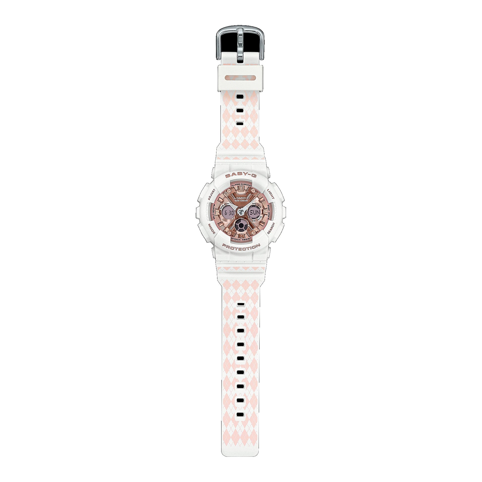 Casio Baby-G jam tangan wanita dengan format analog digital. Manjakan diri Anda di sekolah dengan pesona dan keceriaan tampilan muda di BA-130 yang selalu populer dengan casing besar. Kotak-kotak tartan merah muda dan coklat berasap membuat aksen modis yang manis untuk tampilan sekolah Anda.