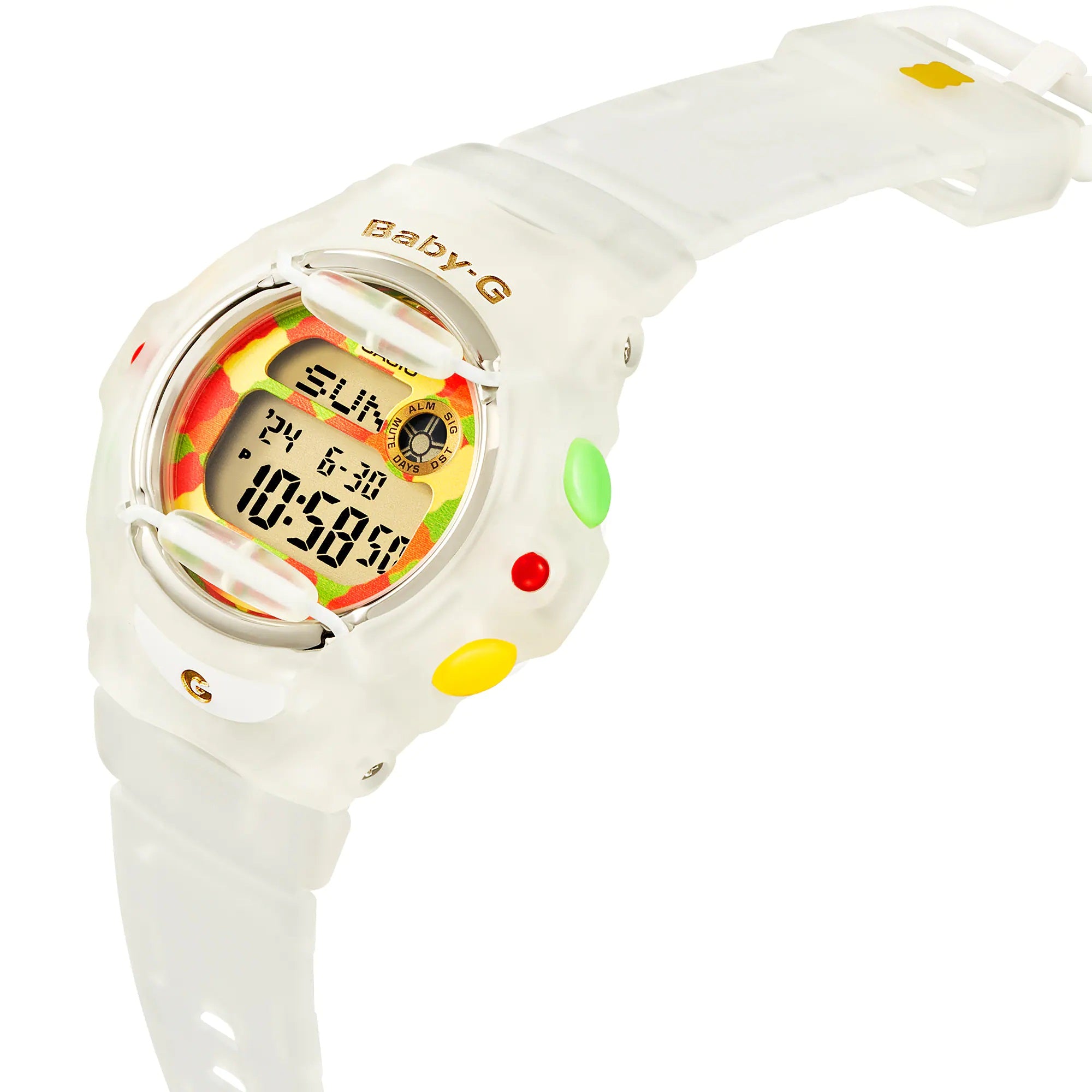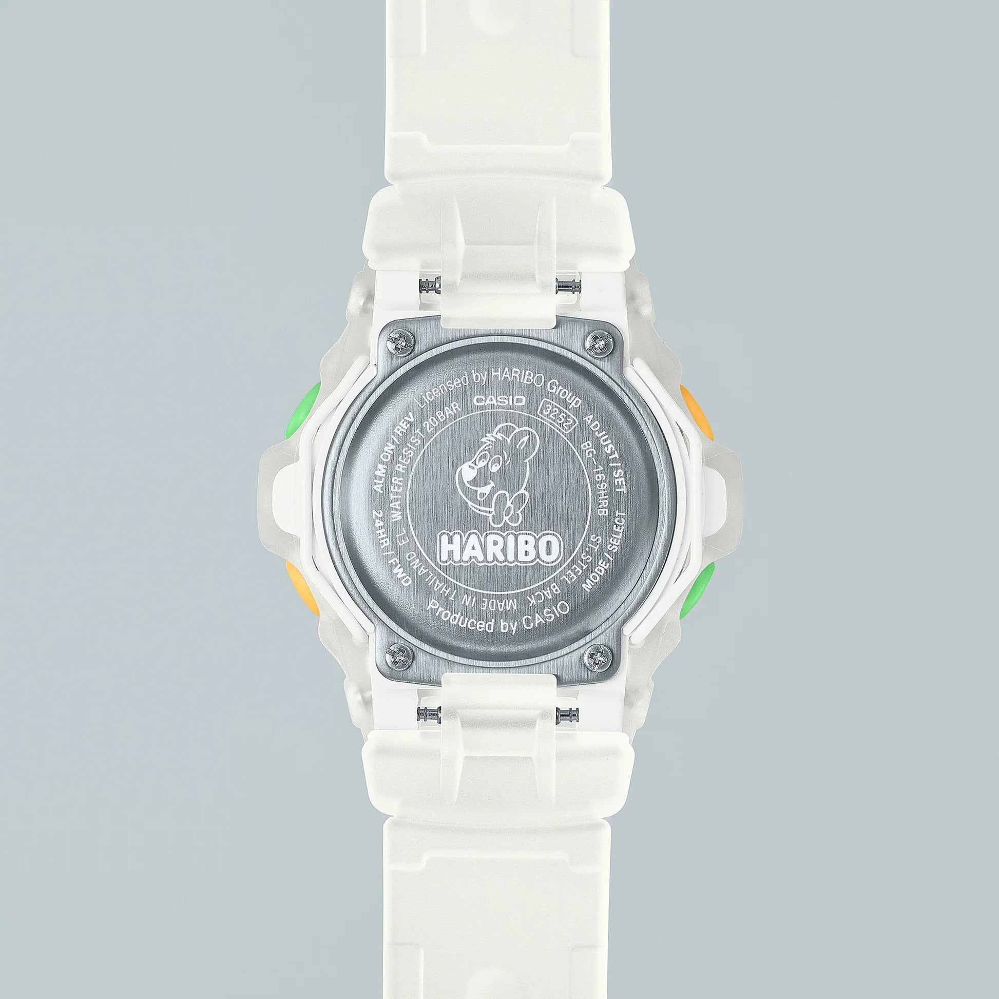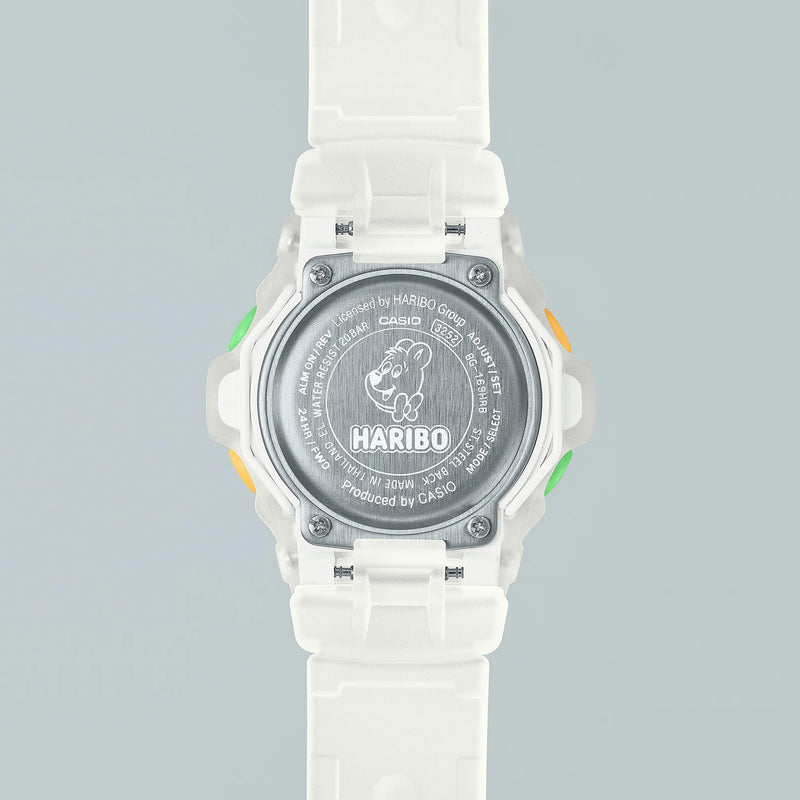 Casio Baby-G jam tangan wanita dalam format digital. Dengan tampilan yang kasual untuk wanita aktif, hadir model baru yang diproduksi bekerja sama dengan HARIBO, produsen permen bergetah Jerman yang populer. Setiap elemen desain jam tangan ini menyenangkan dan menyenangkan, yang sangat cocok dengan dunia HARIBO. Bahan semi-transparan putih dasarnya beraksen oleh warna-warna Goldbears yang populer.
