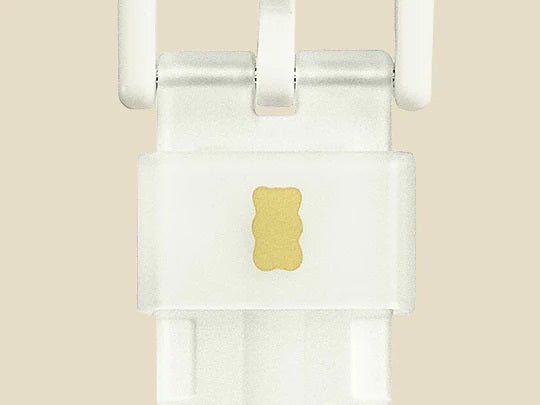 Menghidupkan lampu latar EL jam tangan juga menampilkan pola bentuk HARIBO Goldbears yang selaras dengan pola tetap pada muka jam. Tali jam dan casing model ini terbuat dari resin matte semi-transparan, yang menciptakan rasa yang sama seperti permen bergetah dan melengkapi warna cerah desainnya.