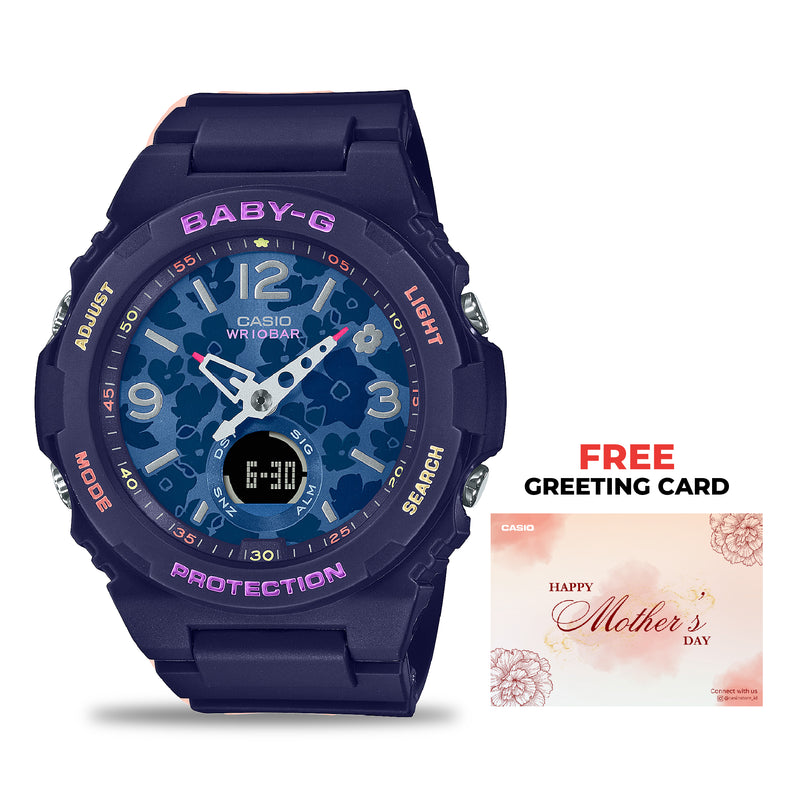 Casio Baby-G jam tangan wanita dengan format analog digital. Manjakan sisi menyenangkan Anda dengan dial bunga dan sentuhan ceria seperti jarum jam berbentuk lentera dan aksen dipenuhi warna. Penanda bezel dalam warna pendar yang menyala dalam gelap dan lampu LED untuk pembacaan yang jelas menjamin Anda selalu tepat waktu dan modis baik siang maupun malam.