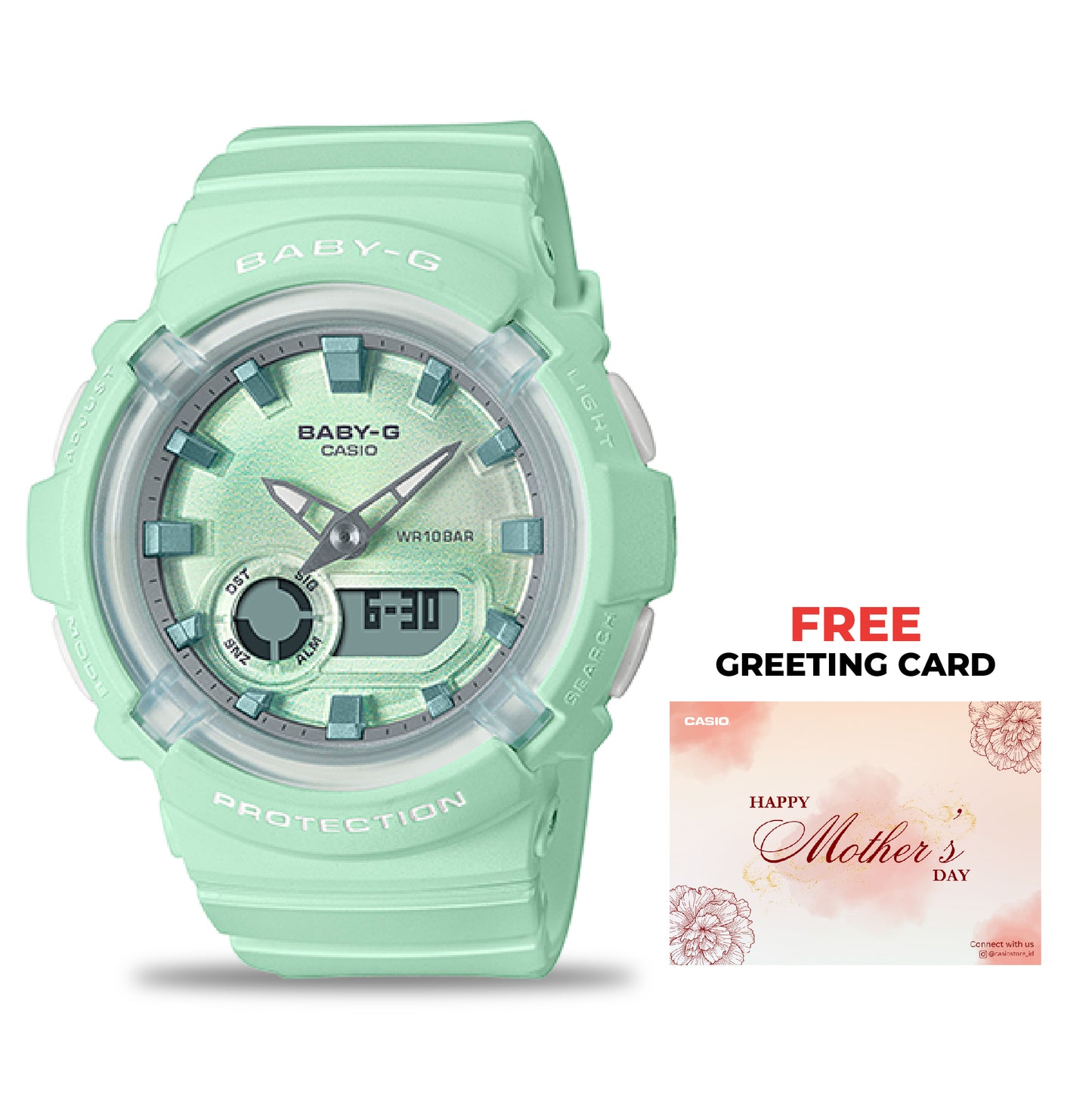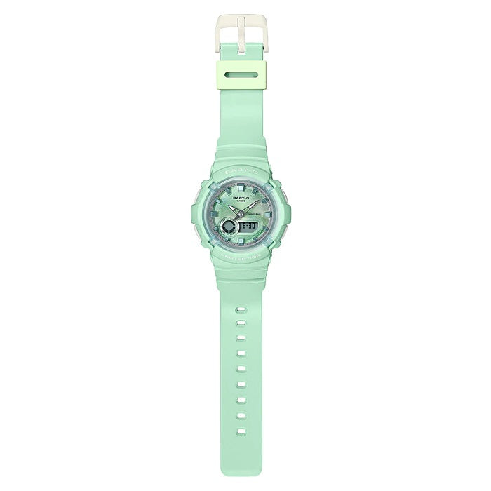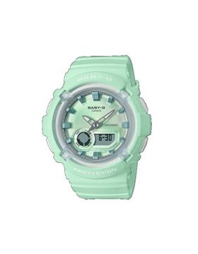 "Casio Baby-G jam tangan wanita dengan format analog digital. Seri BGA-280 memadukan beberapa bagian untuk menciptakan desain inovatif dan penuh warna. Model ini memiliki casing yang kuat dengan bentuk bulat yang tampak imut dan disempurnakan dengan sentuhan sporty pada jarum jam berbahan logam.