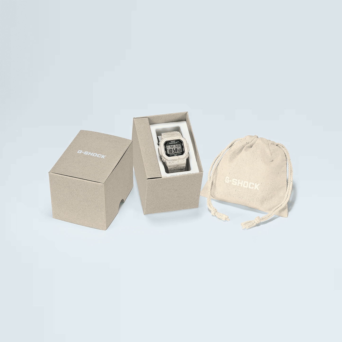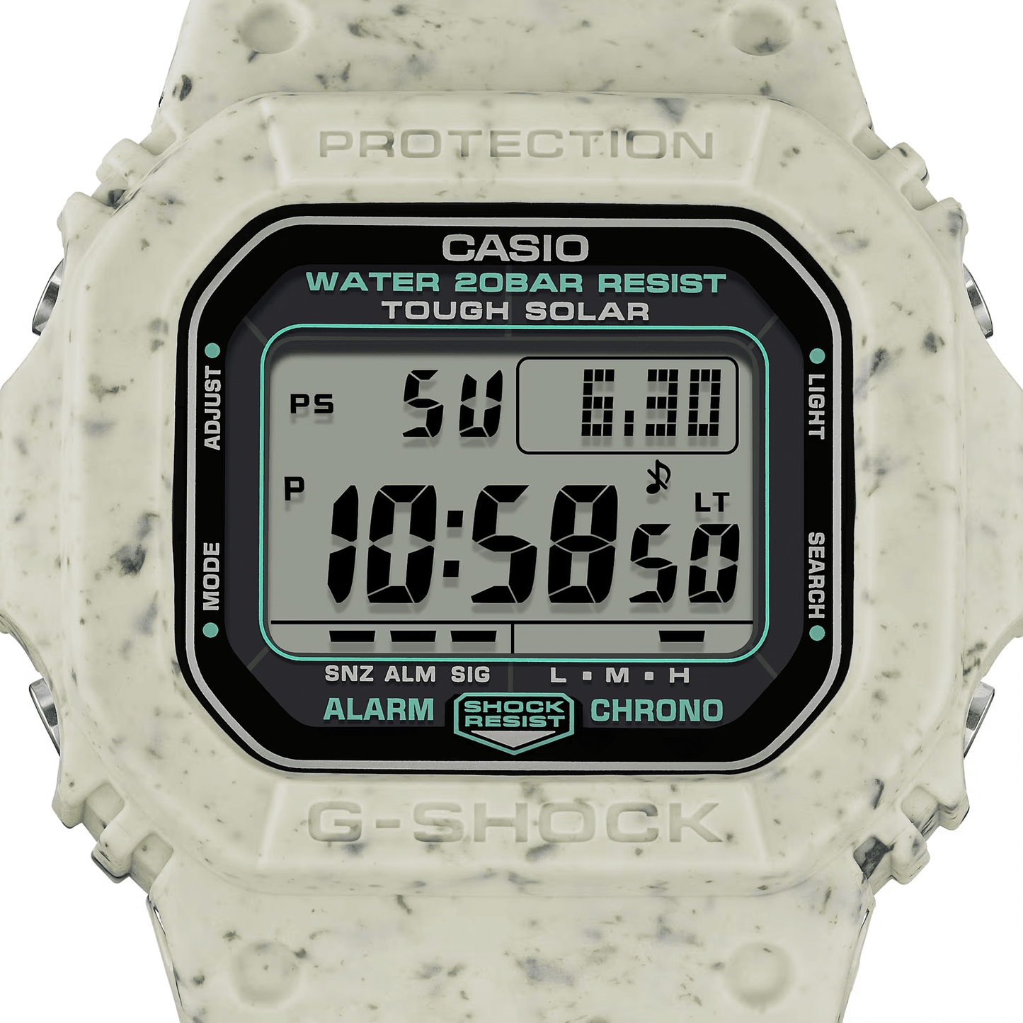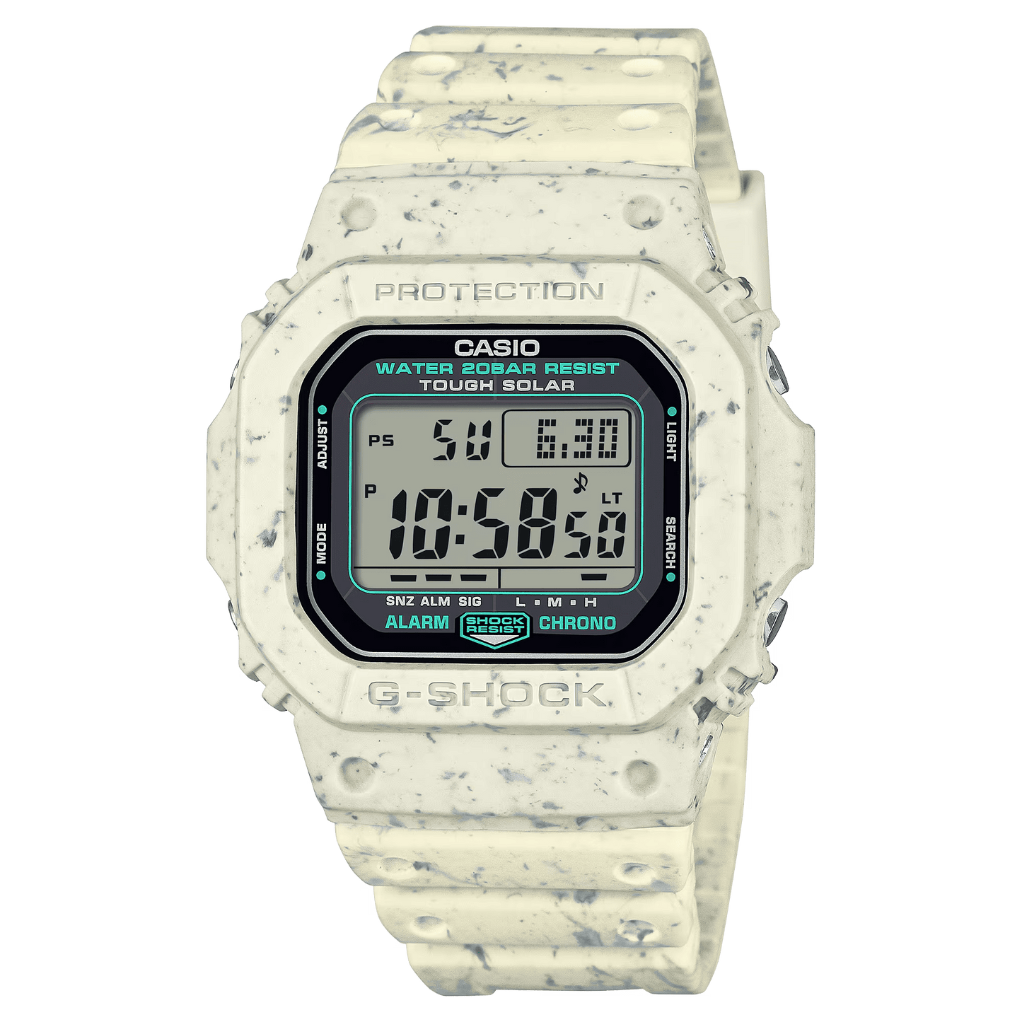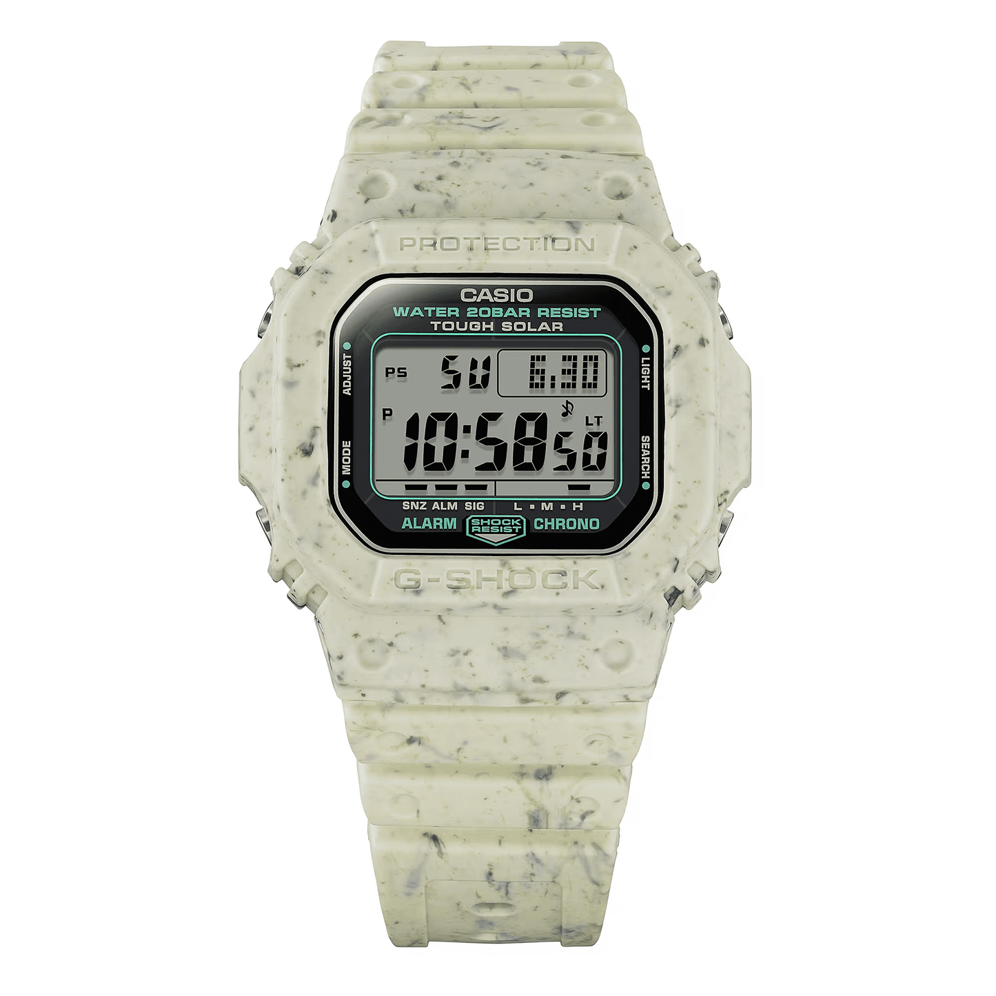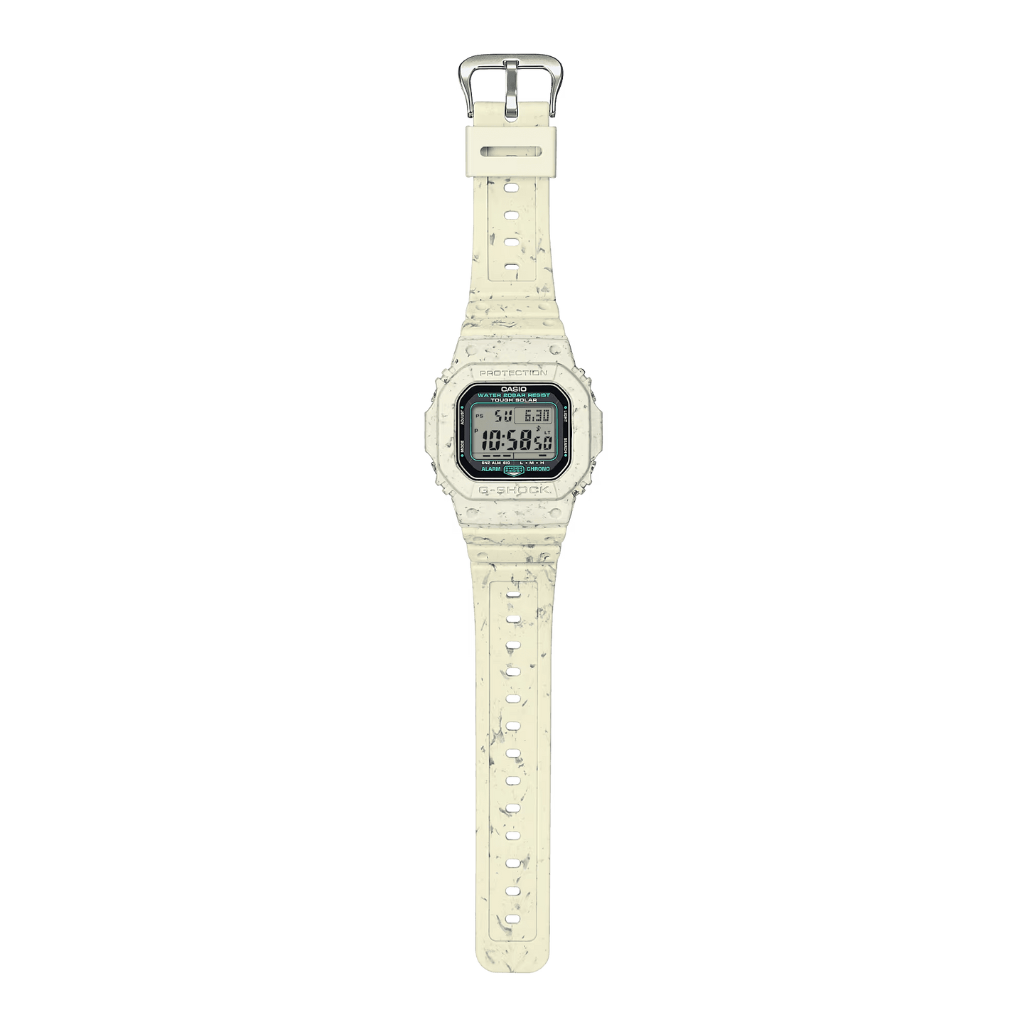 Dilengkapi dengan G-5600 Tough Solar, yang dapat mengisi daya arloji bahkan dengan sedikit cahaya dalam ruangan, serta bezel dan tali jam yang terbuat dari potongan resin daur ulang, arloji ini sepenuhnya mewujudkan komitmen Anda untuk membantu mengurangi dampak lingkungan.