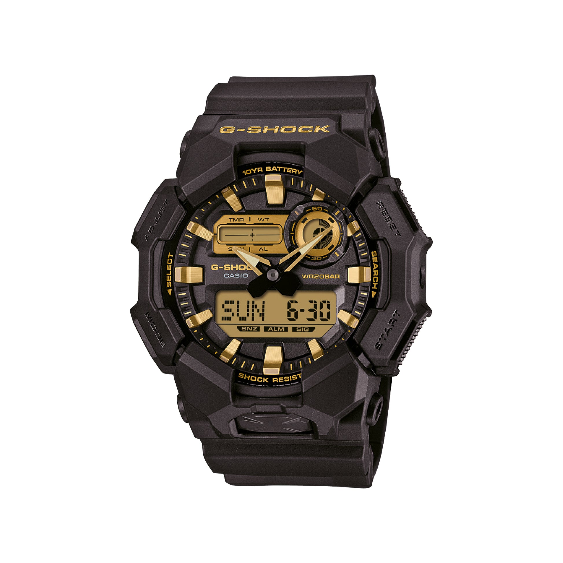 Semakin kokoh. Tunjukkan kepercayaan diri yang berani dengan G-SHOCK dalam balutan warna hitam dan emas yang mencolok.