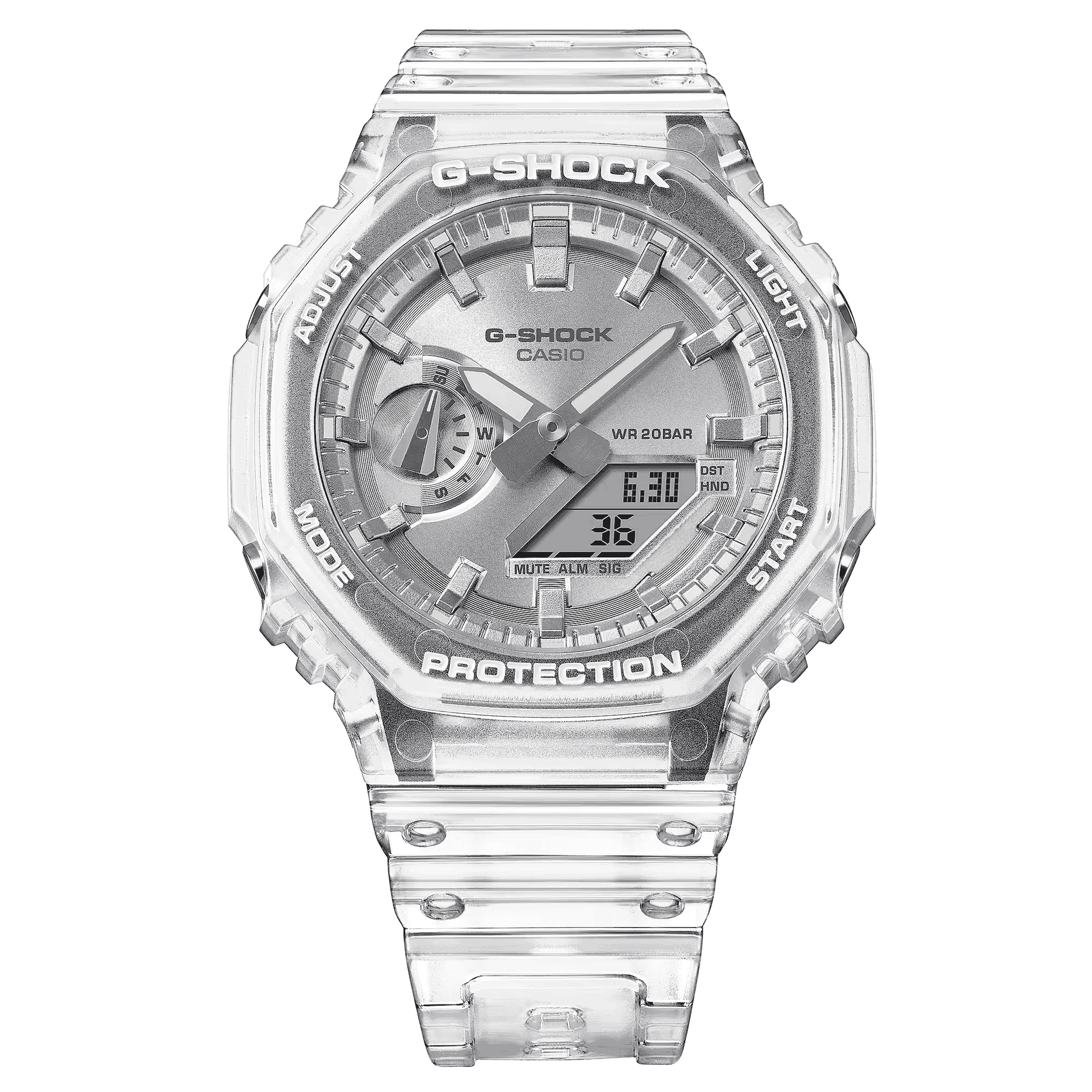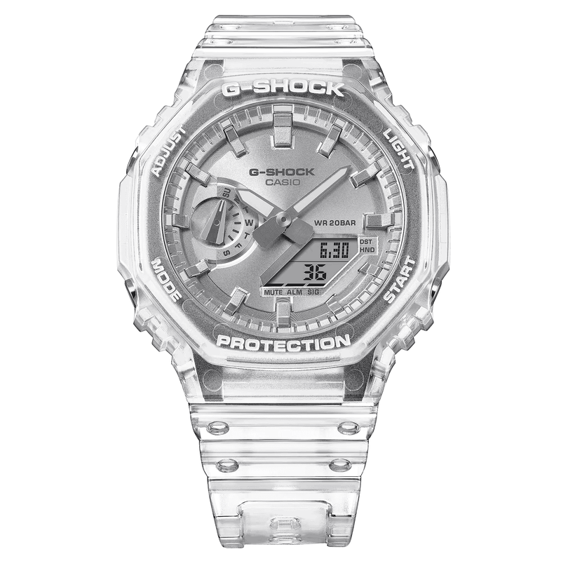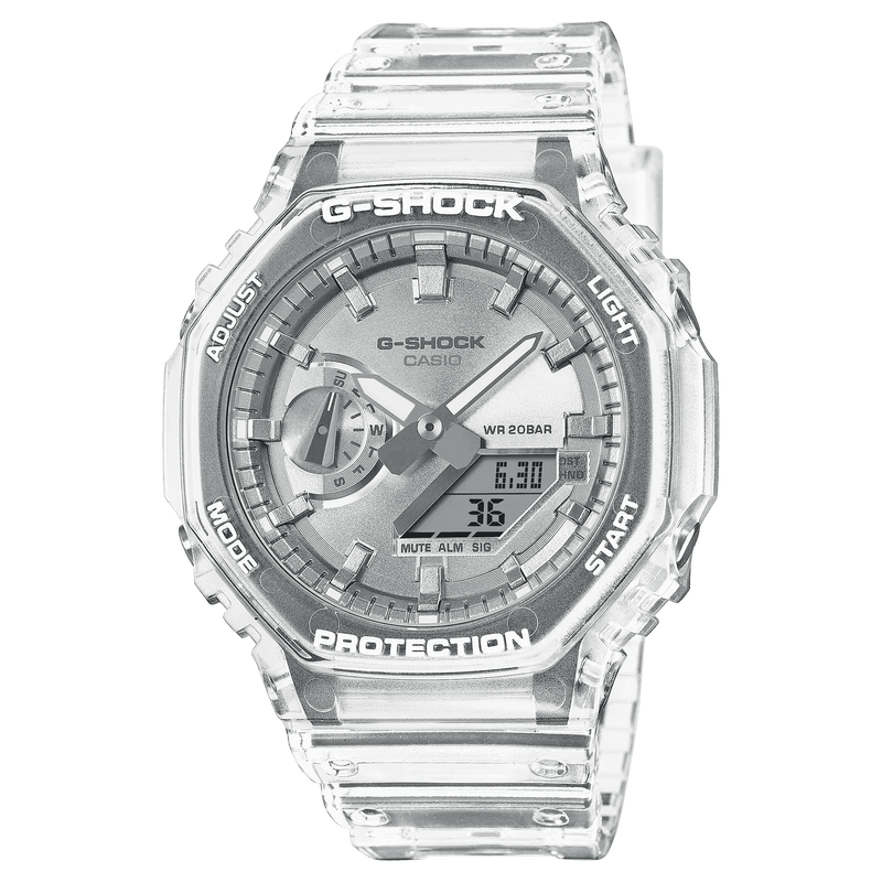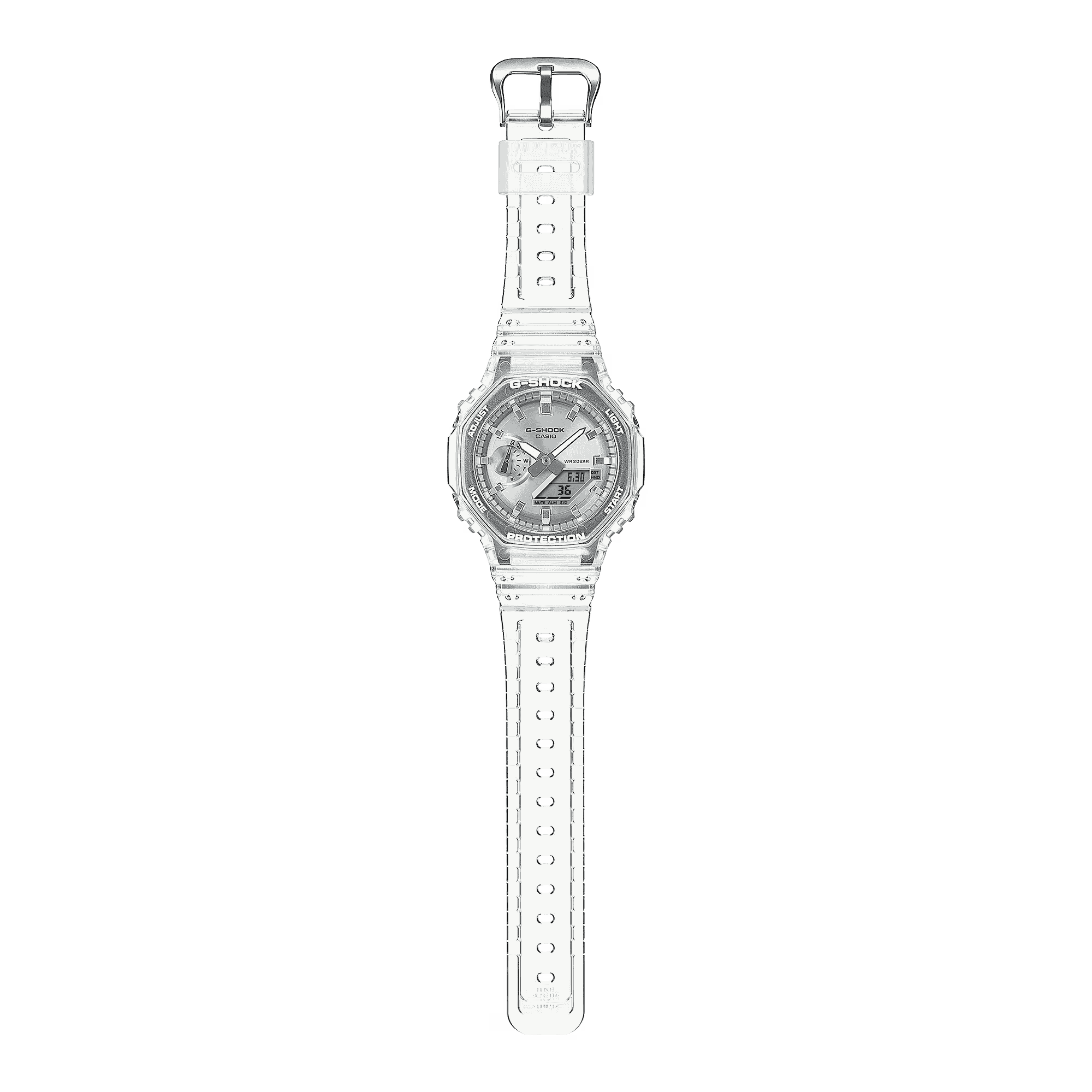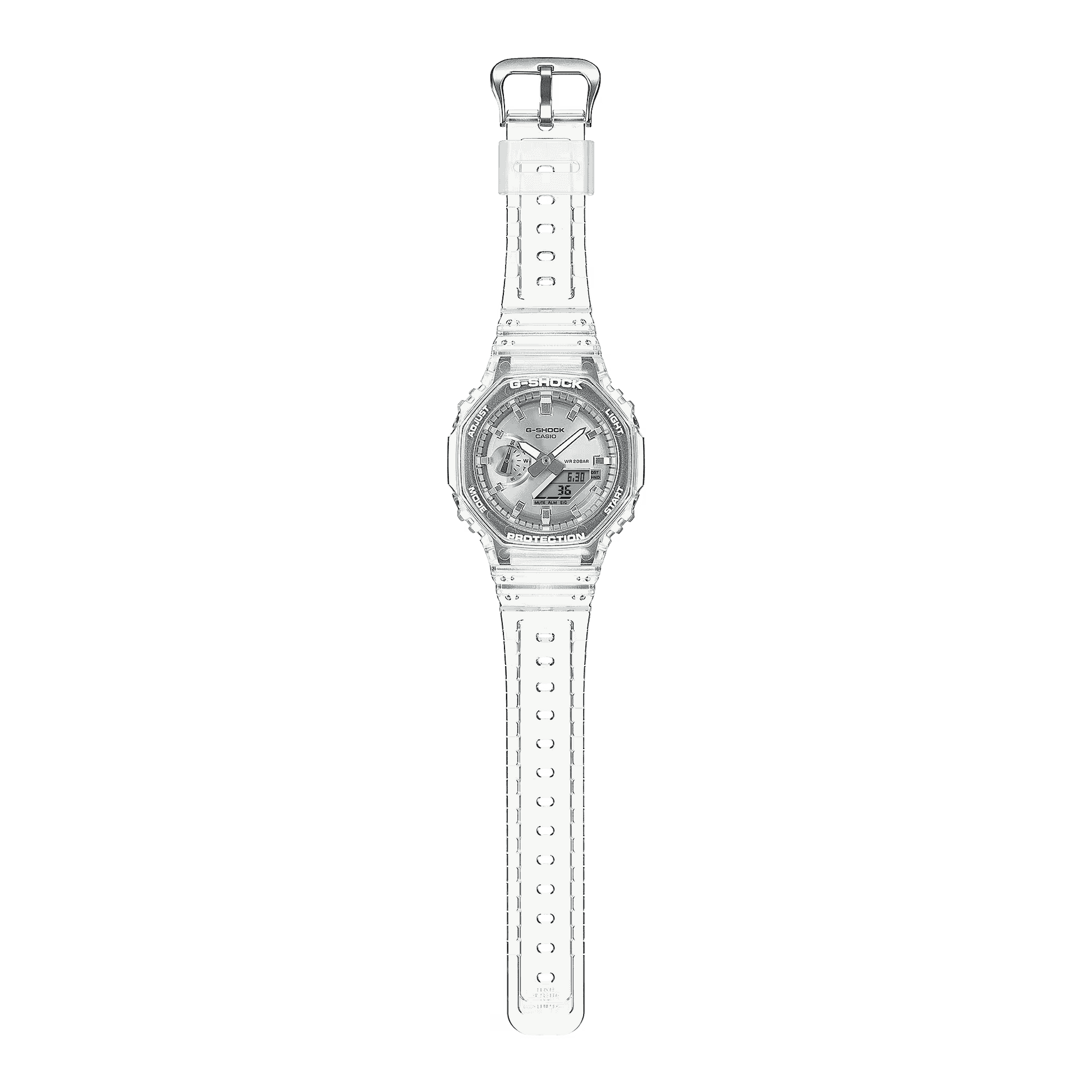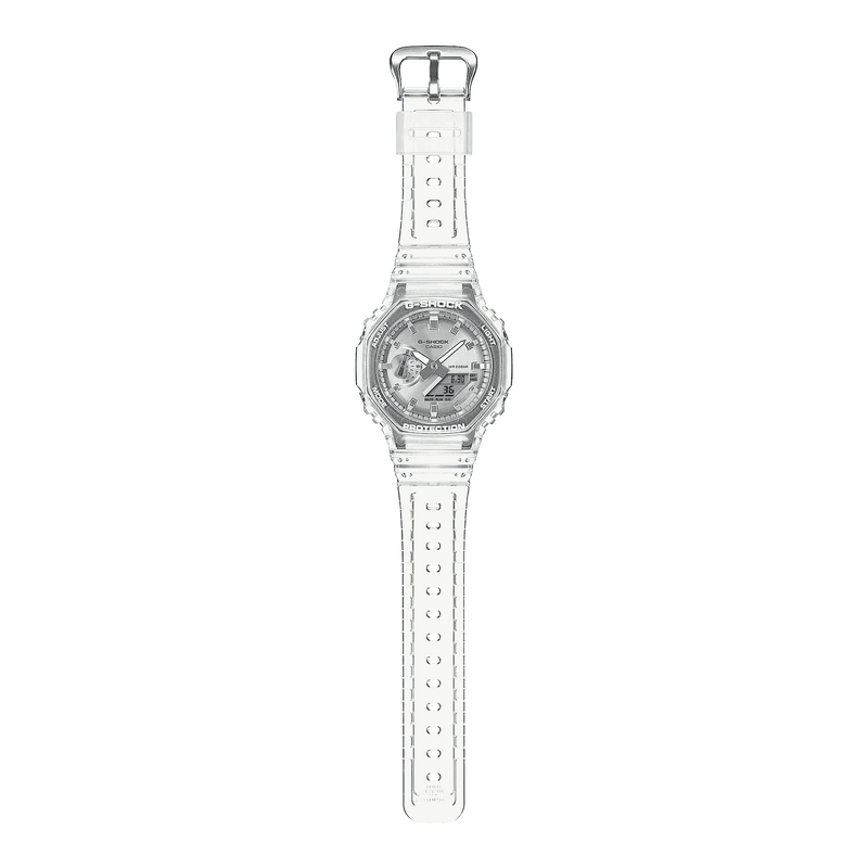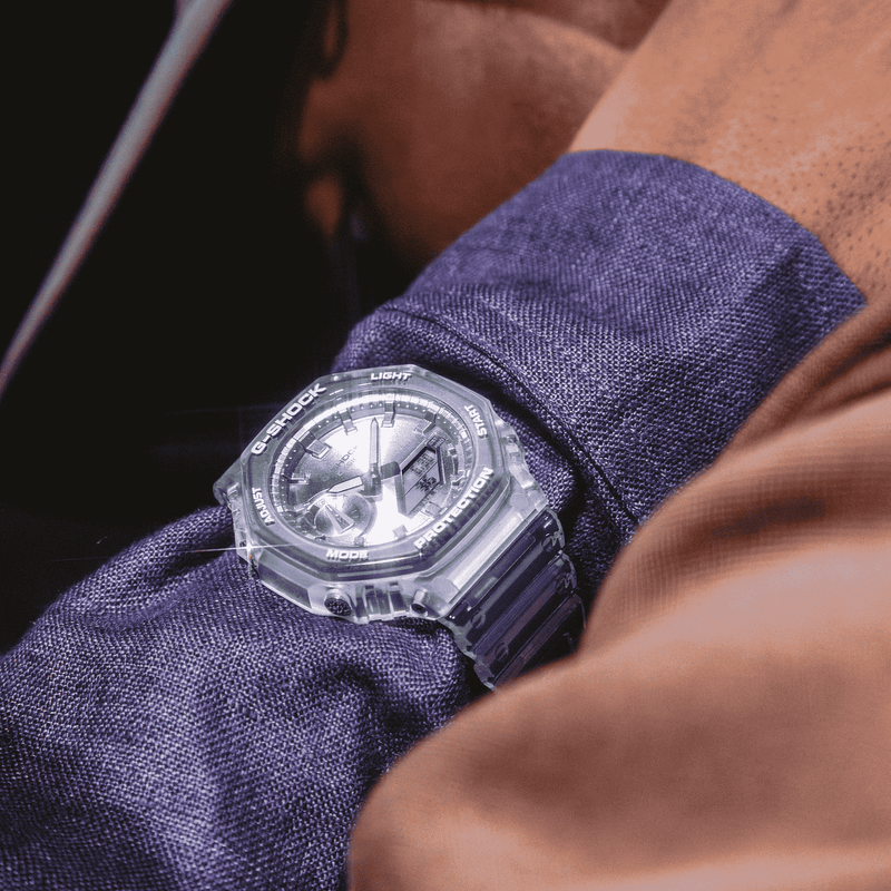GA-2100 dengan bezel segi delapan dipasangkan dengan pelat jam yang dilapisi dengan lapisan uap metalik dengan warna yang populer - biru langit - diimbangi dengan tali jam yang tembus pandang untuk tampilan yang keren dan penuh percaya diri.