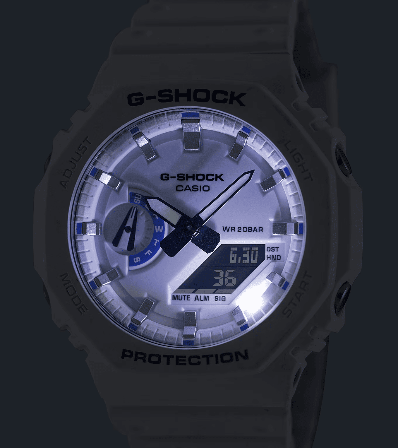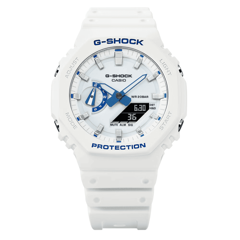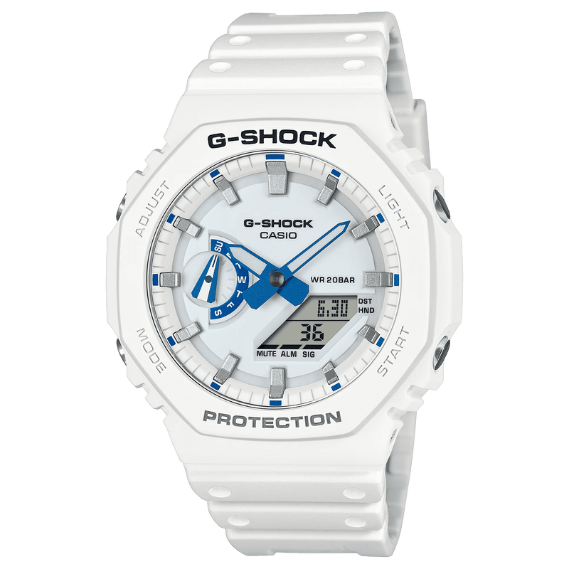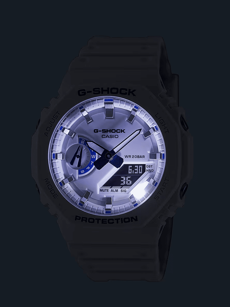 Casio G-Shock Jam Tangan Pria dengan format Analog Digital GA-2100HDS-7A1DR. Dapatkan inspirasi Anda dari laut musim panas, dengan G-SHOCK warna putih dan biru. Bagian depan jam tangan yang berpendar biru akan bersinar secara ajaib di malam hari, membangkitkan kilau plankton yang mengambang di laut. Dipasangkan dengan skema warna putih dan biru, desainnya dengan indah menangkap transformasi dinamis pantai dari kecemerlangan matahari siang hari ke warna malam hari yang lembut. Gaya berkilau yang terinspirasi dari laut ini dapat dengan mudah mengalir dari suasana santai hingga situasi kerja.