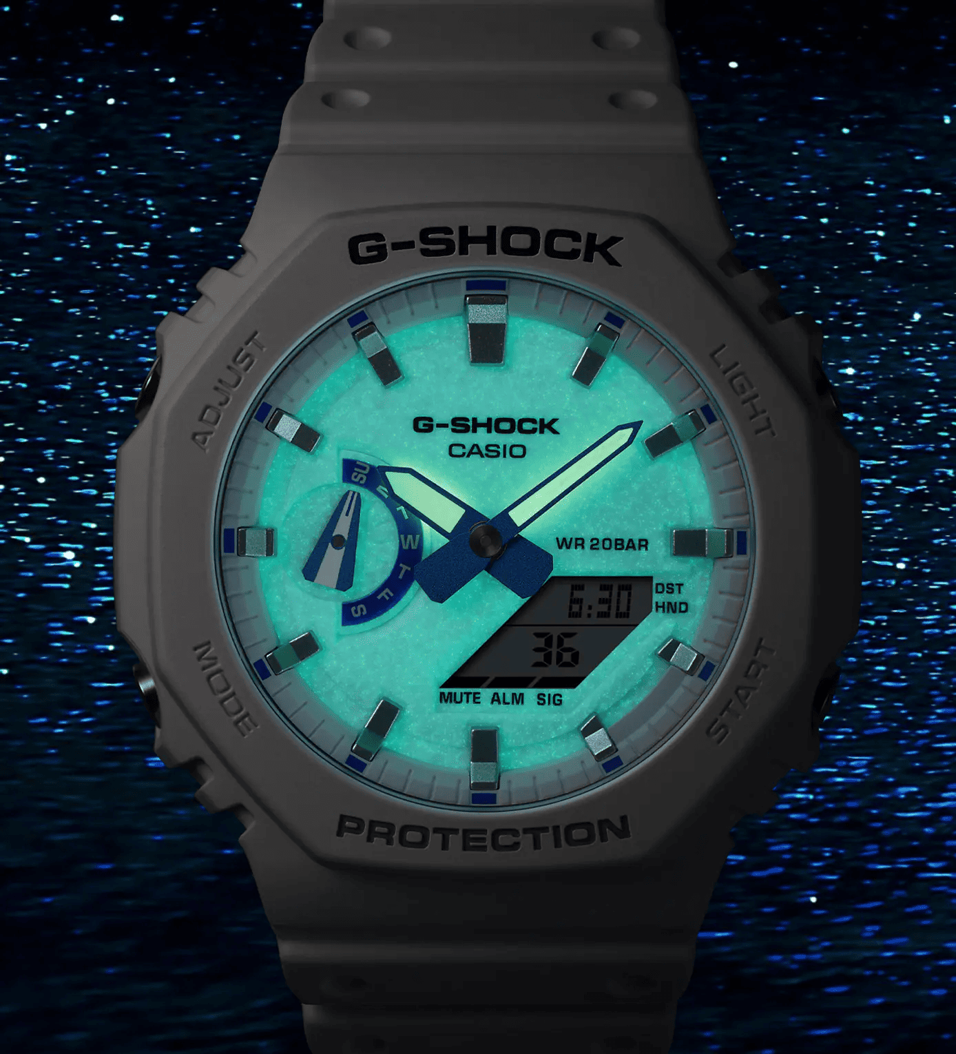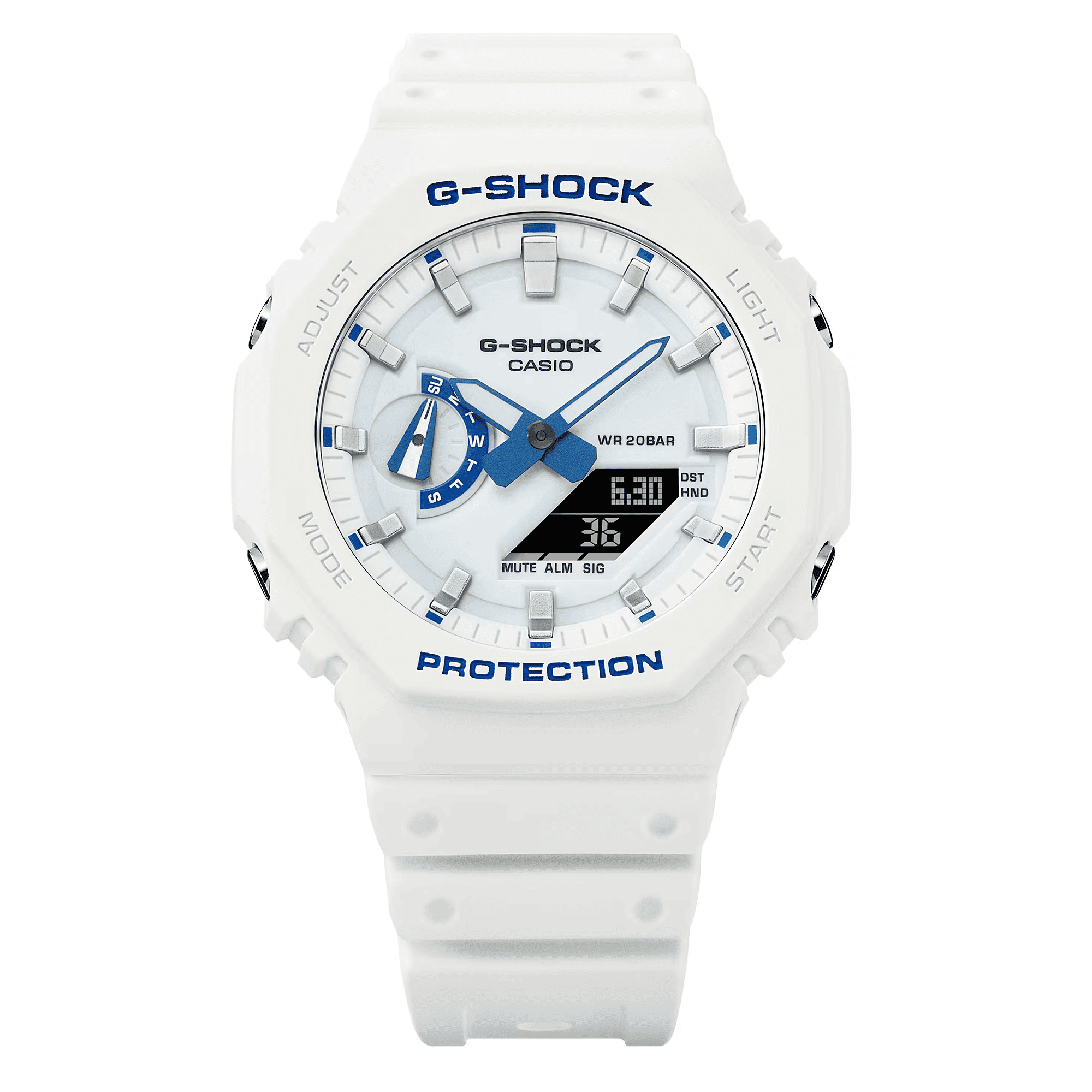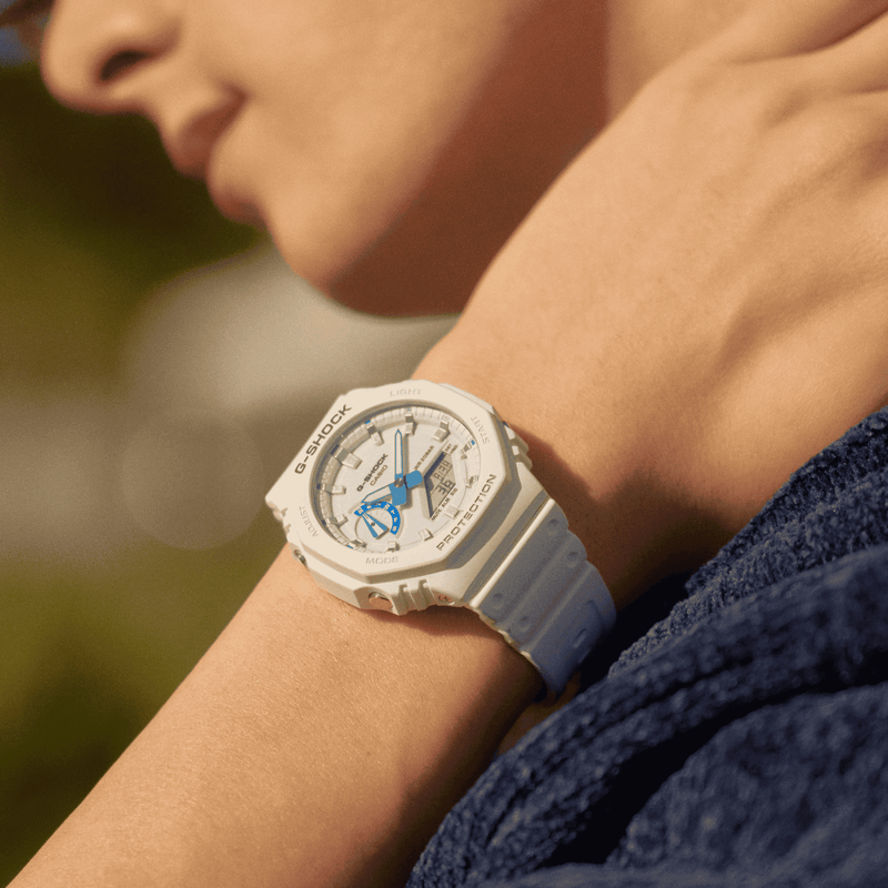 Casio G-Shock Jam Tangan Pria dengan format Analog Digital GA-2100HDS-7A1DR. Dapatkan inspirasi Anda dari laut musim panas, dengan G-SHOCK warna putih dan biru. Bagian depan jam tangan yang berpendar biru akan bersinar secara ajaib di malam hari, membangkitkan kilau plankton yang mengambang di laut. Dipasangkan dengan skema warna putih dan biru, desainnya dengan indah menangkap transformasi dinamis pantai dari kecemerlangan matahari siang hari ke warna malam hari yang lembut. Gaya berkilau yang terinspirasi dari laut ini dapat dengan mudah mengalir dari suasana santai hingga situasi kerja.