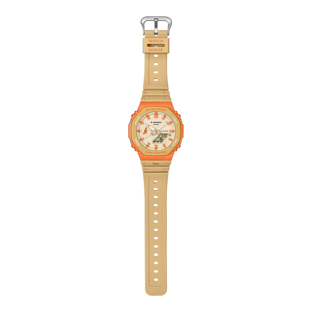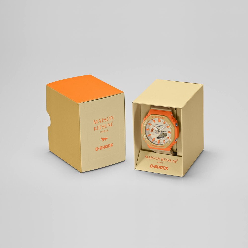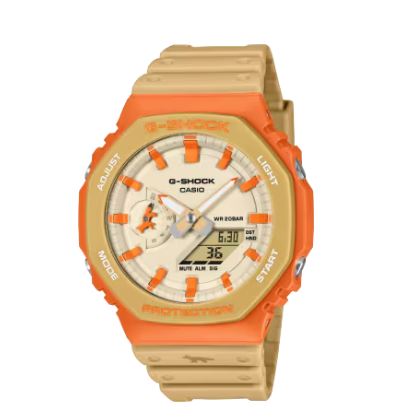 Model GA-2100, yang tengah naik daun di dunia streetwear, hadir dengan skema warna camaïeu natural dan netral yang terinspirasi dari arsitektur Haussmannian, dipadukan dengan bezel oranye berani yang menggambarkan cahaya matahari terbenam di cakrawala kota Paris.