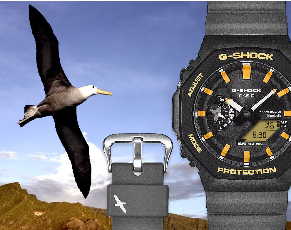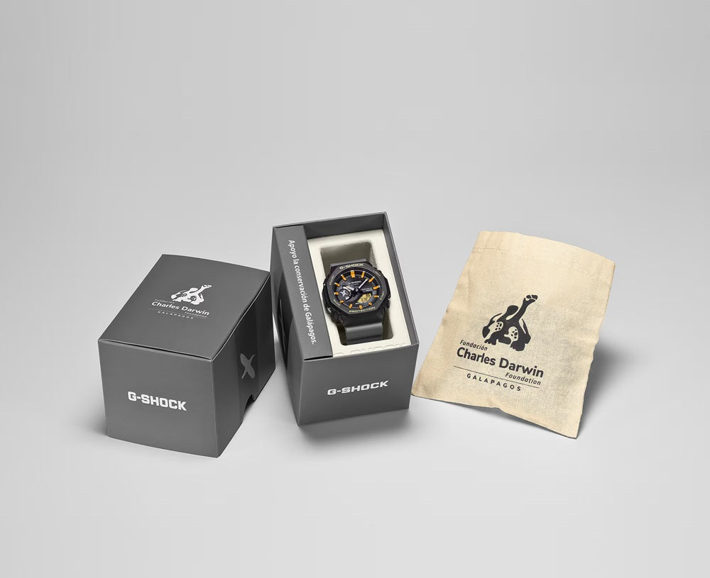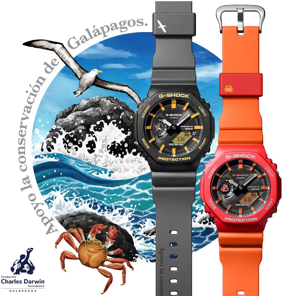 Casio G-SHOCK Jam Tangan Pria dengan format Analog Digital GA-B2100DF-1ADR. Nyatakan komitmen Anda terhadap Galápagos dengan jam tangan kolaborasi G-SHOCK yang dibuat bersama Charles Darwin Foundation — dua model hebat yang terinspirasi oleh dua spesies ikonik yang menghuni pulau-pulau indah ini. Kolaborasi keempat kami dengan Charles Darwin Foundation, sebuah organisasi yang terlibat dalam kegiatan konservasi lingkungan di Kepulauan Galápagos, telah menghasilkan dua jam tangan kemitraan yang berbeda: satu terinspirasi oleh Albatros Galápagos dan yang lainnya oleh Kepiting Sally Lightfoot. Berdasarkan GA-B2100 dengan Smartphone Link dan pengisian daya Tough Solar, dan menampilkan tali dan bezel yang terbuat dari resin berbasis bio yang diproduksi dari sumber daya organik terbarukan, jam tangan ini menghormati makhluk-makhluk yang menggemaskan ini dengan fungsi dan material yang berfokus pada lingkungan, warna yang cerah, dan desain yang unik. GA-B2100DF-1A terinspirasi oleh Albatros Galápagos, salah satu burung terbesar di pulau-pulau tersebut, dengan rentang sayap lebih dari dua meter. Gerakannya yang anggun saat meluncur di arus udara yang naik digambarkan dalam bentuk jarum penunjuk dan pada lingkaran tali jam. Peta Kepulauan Galápagos menghiasi bagian muka jam, dipertegas dengan detail kuning yang mengingatkan pada paruh burung. Bagian belakang casing diukir dengan logo dan nama Yayasan Charles Darwin dalam bahasa Spanyol, dan tali jam dicetak dengan pernyataan "Apoyo la conservación de Galápagos." (Bahasa Spanyol untuk "Saya mendukung konservasi Galápagos.") Jam tangan ini juga dilengkapi dengan kemasan khusus bebas plastik, yang sesuai dengan kolaborasi pembuatan jam tangan dengan Yayasan Charles Darwin.