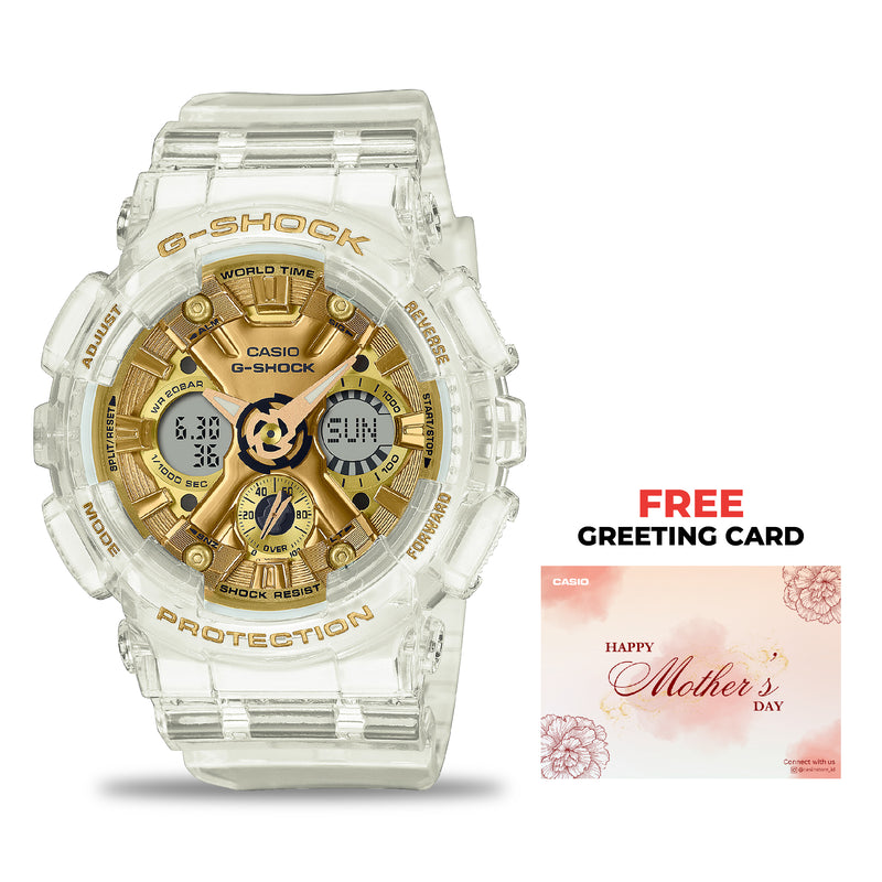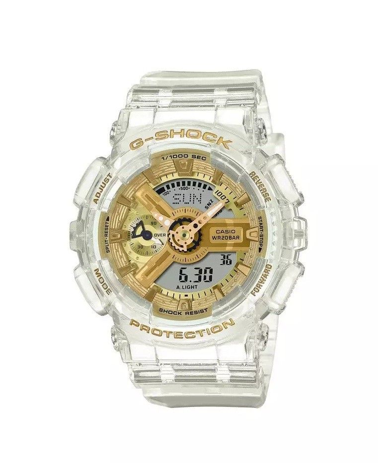 Casio G-Shock jam tangan wanita dengan format analog digital. Dengan segarkan tampilan Anda dengan G-SHOCK memukau yang bersinar seperti matahari. Bagian muka yang berkilau dalam warna emas murni berkat deposisi uap metalik bercahaya dipadukan dengan tali jam tembus pandang untuk melengkapi desain yang berkilau seperti aksesori emas penuh gaya. Pilih antara GMA-S110 atau GMA-S120 yang selalu populer, atau tampilan oktagonal klasik GMD-S5600.