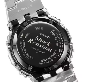 Menciptakan arloji logam penuh dengan struktur tahan guncangan G-SHOCK asli yang sama bukanlah hal yang mudah. Kami memasang komponen penyangga yang terbuat dari resin halus di antara bezel baja tahan karat dan casing serta menggunakan lug bercabang tiga untuk sambungan tali jam guna menyebarkan guncangan ke pipa penghubung. Casing baja tahan karat juga dilengkapi dengan konstruksi sekrup-kunci yang sama seperti aslinya untuk memastikan segel yang rapat.