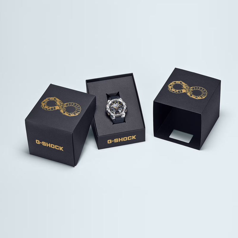 GST-B400 yang ramping ini menampilkan motif ouroboros, simbol keberuntungan kuno berupa ular yang memakan ekornya sendiri, yang melambangkan ketidakterbatasan dan keabadian.