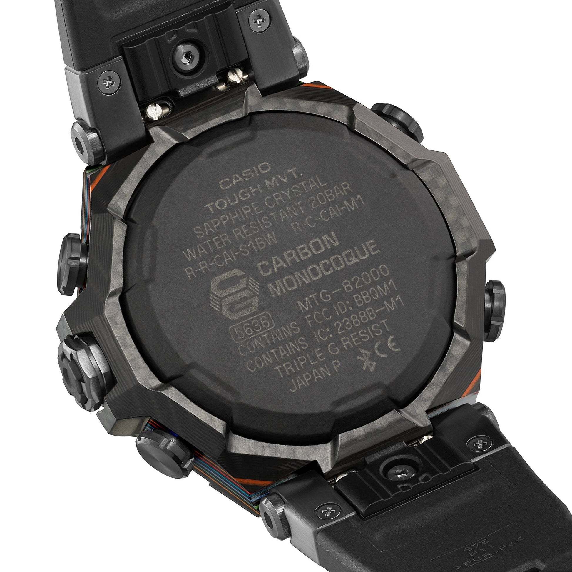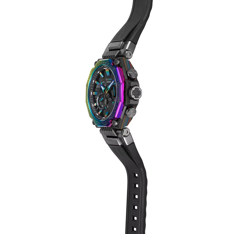 Terinspirasi oleh terangnya lampu kota besar, MTG-B2000YR menampilkan kerangka karbon berlapis-lapis yang dibuat dengan melaminasi karbon dengan serat kaca multi-warna. Bingkai cincinnya, terbuat dari baja tahan karat berlapis ion pelangi, diukir dalam pola yang membangkitkan lanskap perkotaan. Tampilan tanggal berwarna-warni dan tanda indeks berwarna pelangi, jarum jam, dan logo MT-G menambah perayaan akhir warna yang canggih.