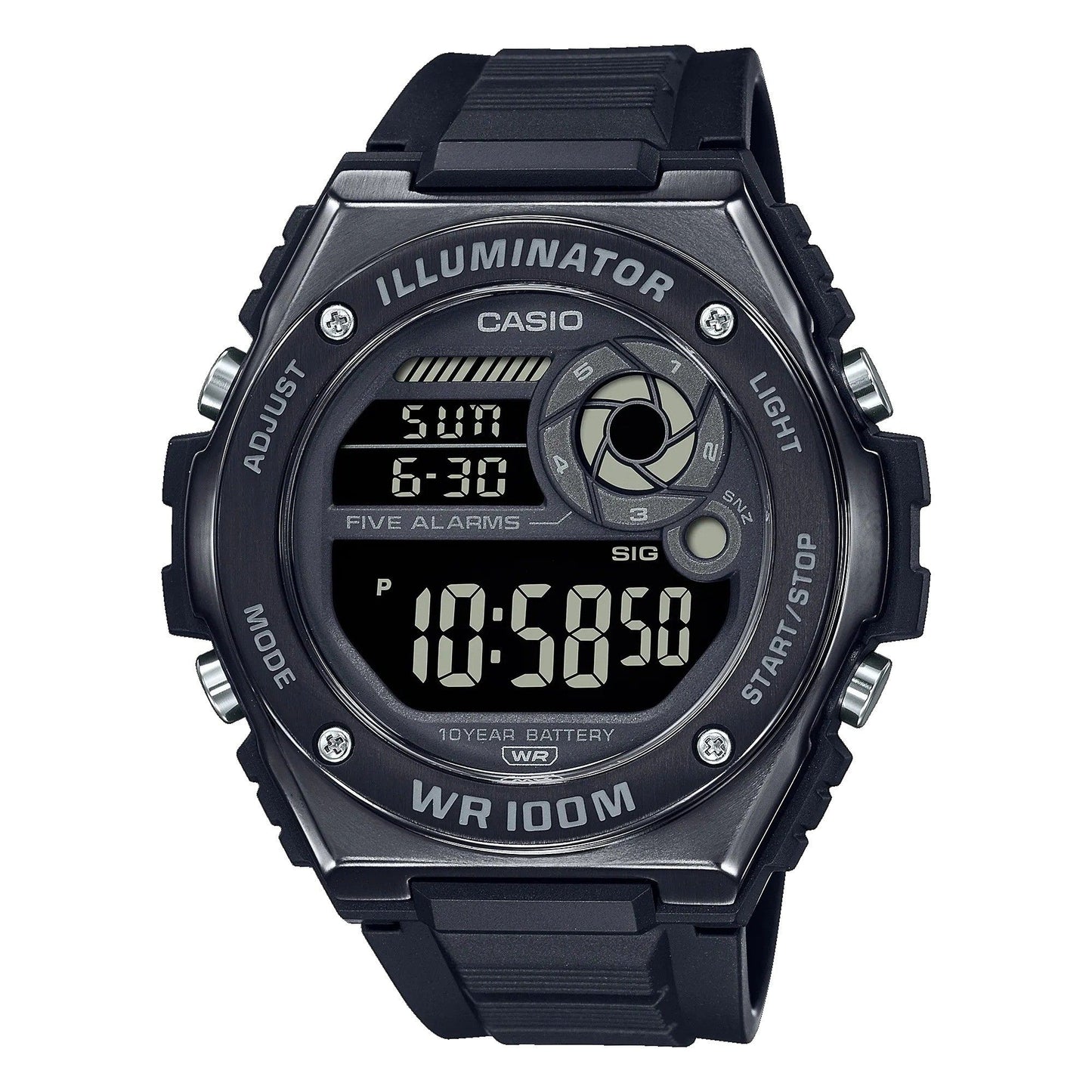 Menampilkan casing resin dan bezel logam, jam tangan ini dikemas dengan fungsi praktis seperti stopwatch, penghitung waktu mundur, alarm, dan tampilan waktu ganda.