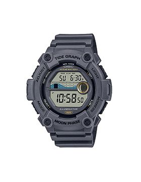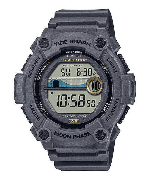 Jam tangan Casio pria dengan format Digital. Perhatian para pencinta air! Teman yang cocok untuk siapa saja yang menyukai olahraga air. Jam tangan ini memiliki desain eksterior tahan lama, ketahanan air 100 meter, dan masa pakai baterai 10 tahun. Kemudian tambahkan grafik gelombang, data bulan, dan lampu LED untuk memastikan Anda dapat dengan mudah membaca jam meskipun dalam keadaan gelap, guna memberikan semua hal yang diperlukan pencinta olahraga air, lewat ujung jari Anda. Dengan stopwatch, pengatur waktu, dan alarm, jam tangan serbaguna ini dengan mudah menemani Anda di kantor atau rumah, maupun di kolam renang atau laut.